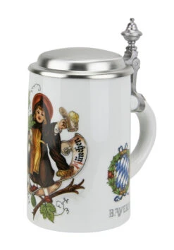 This beer stein features a unique grotto or cave that is molded into the body with an alpine Chamois sitting inside. The Chamois (goat-antelope native to mountains in Europe) is ceramic with hand painted details. The stein body depicts woodland creatures with a family of deer on one side and a mountain goat or Alpine Ibex/Steinbock in the Alps on the reverse. Hand painted relief decoration, dark brown glaze accents and pewter lid.