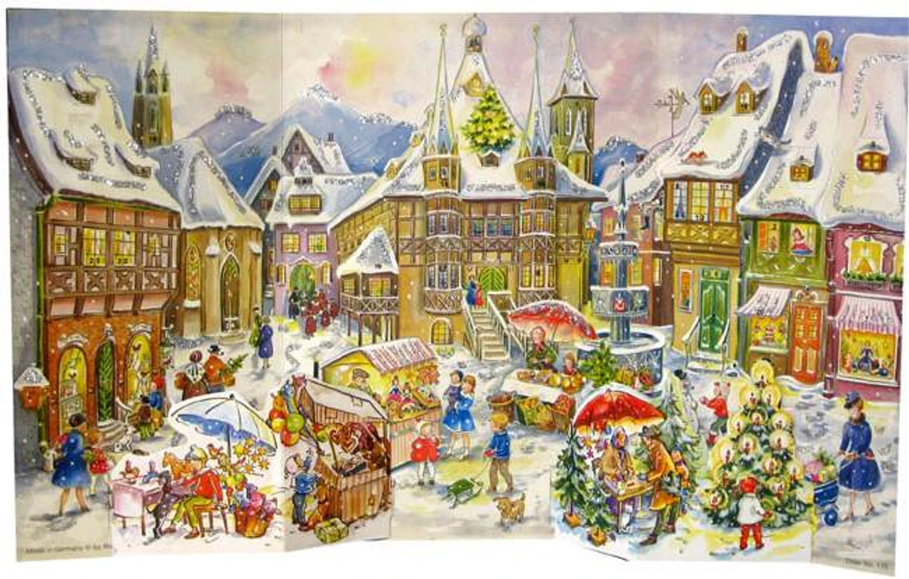 This 18.5″ wide German advent calendar with glitter accented front sections folds out to form a free standing calendar. This advent calendar was originally produced in 1958 and is now being re-printed. Shows a festive German Christmas market set in the town square. Townsfolk bustle about finishing their Christmas shopping, while carolers sing near the church.