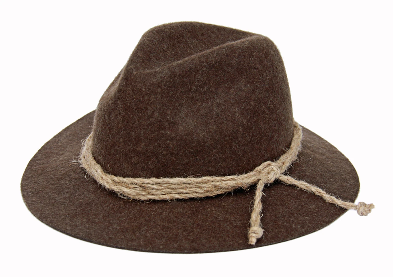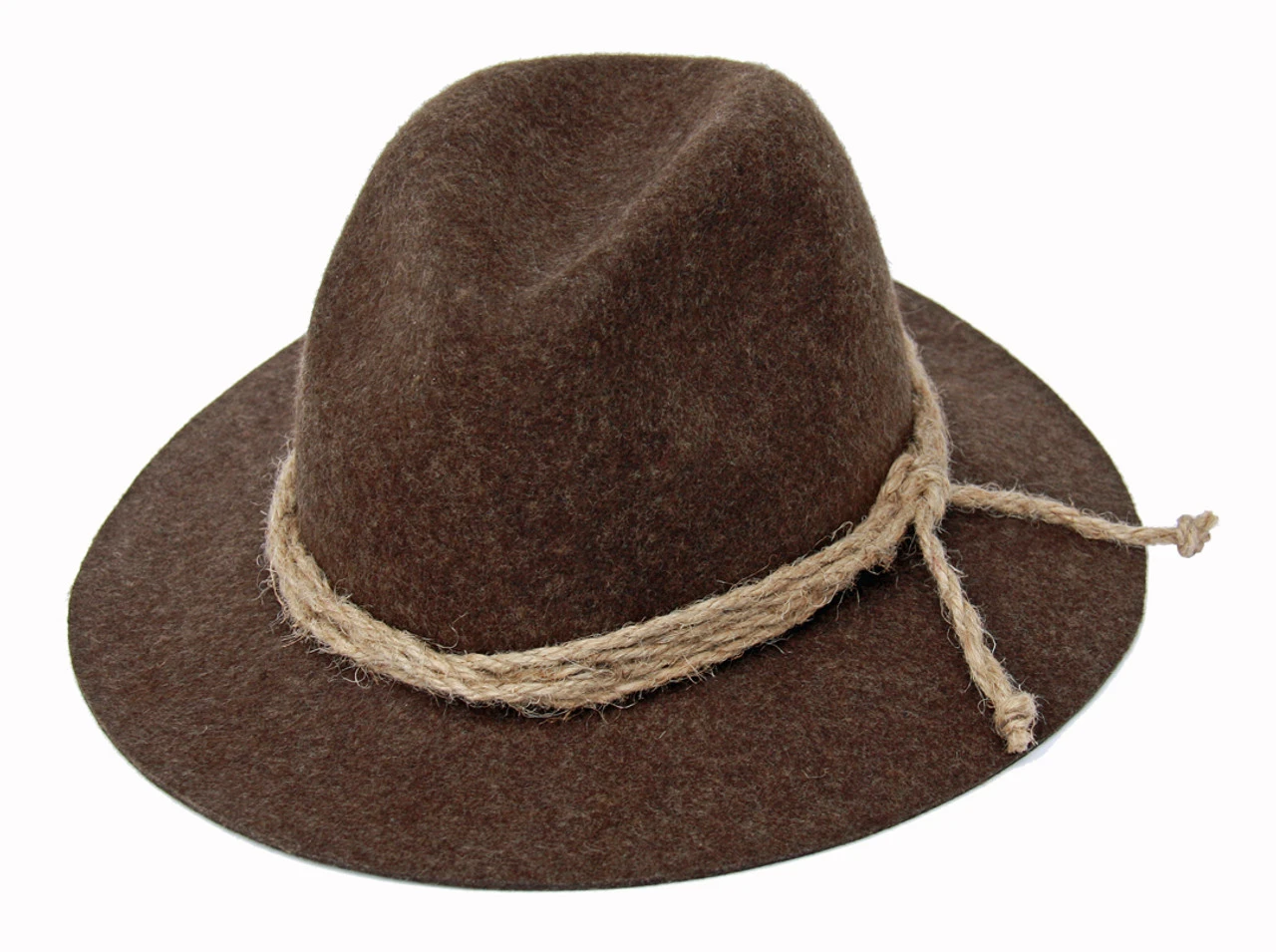 Brown German country hat is made of 100% wool felt and is decorated with a twine cord around the wide brim.