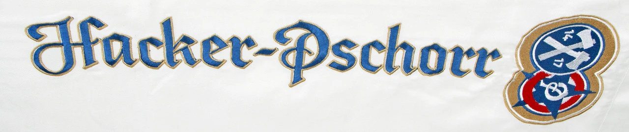 Hacker-Pschorr white cotton long server apron with three front pockets and strings for tying around the waist. The Hacker-Pschorr logo is beautifully embroidered and runs vertically 18″ starting at the pockets.