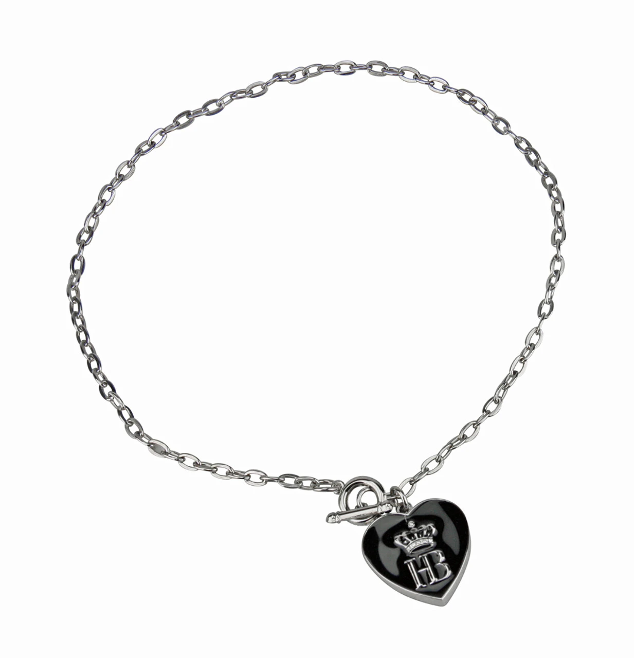 This high quality nickel plated and black enamel necklace features a heart medallion with the HB crown logo. Chain features a toggle clasp on the front.