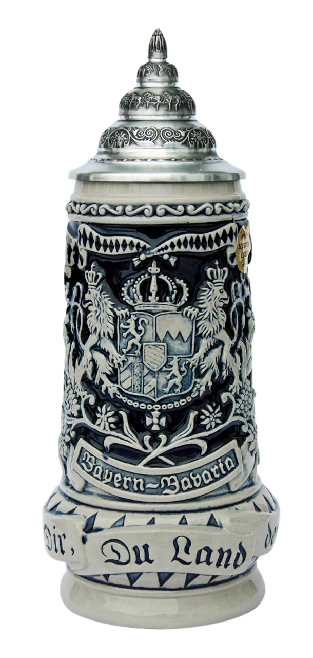 This beer stein honors the Land of Bavaria with a large relief Bavaria lion crest on the front. Alpine flowers, including blue gentian and edelweiss, and waiving Bavarian flags frame the crest. The sides depict two of Bavaria’s most notable landmarks: Neuschwanstein and Munich.