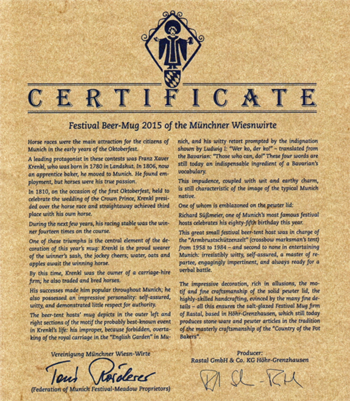 The sides also feature the logos of all the beer tents at the 2015 Oktoberfest depicted in a border of grape leaves. The antique finish pewter lid is embossed with Wiesnwirt and innkeeper “Richard Süssmeier”, who appears dressed as Napoleon to pay tribute to his nick-name “Wirte-Napoleon”.