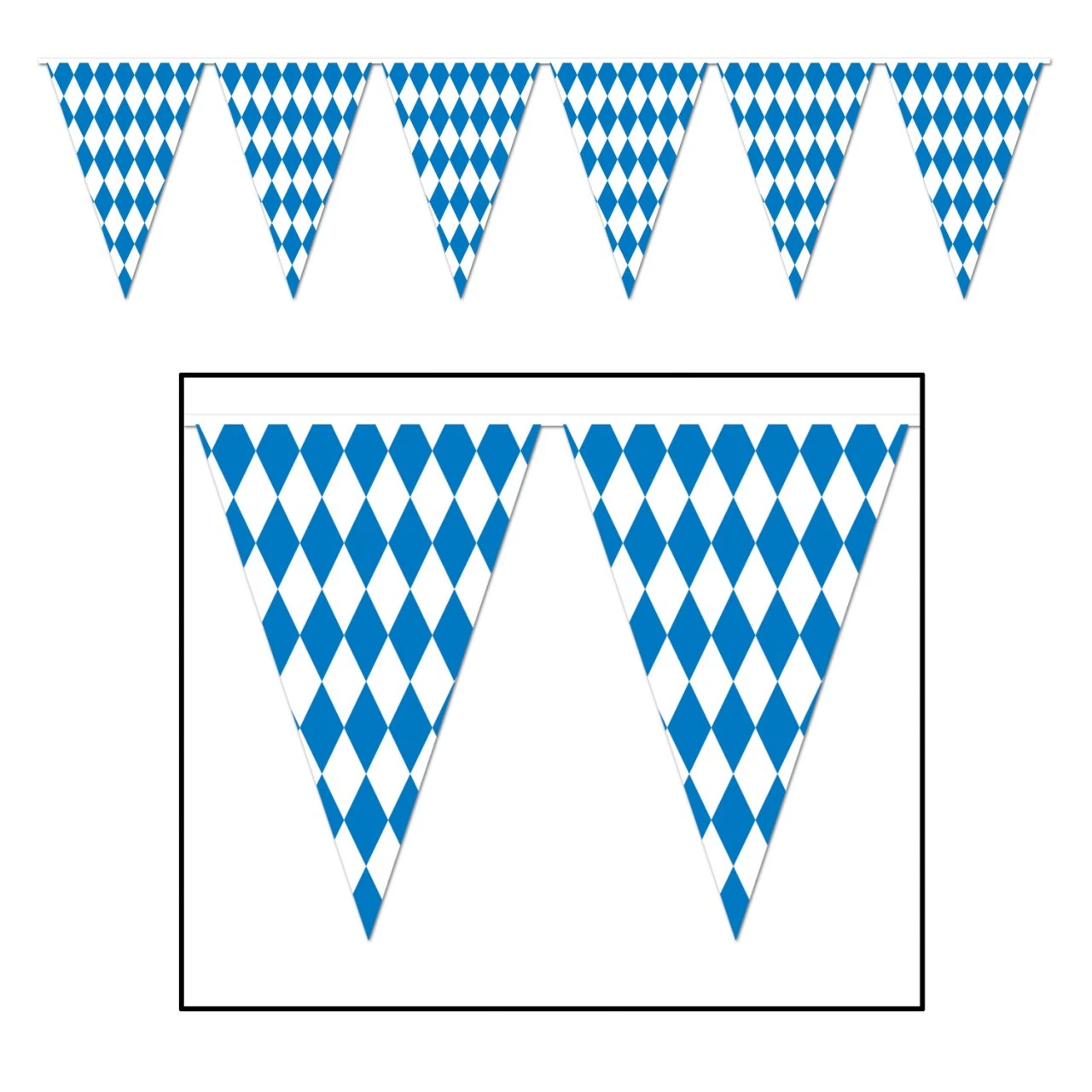 17″ x 120 foot all-weather Oktoberfest Party Pennant Banner has 65 Bavarian blue diamond pattern pennants.