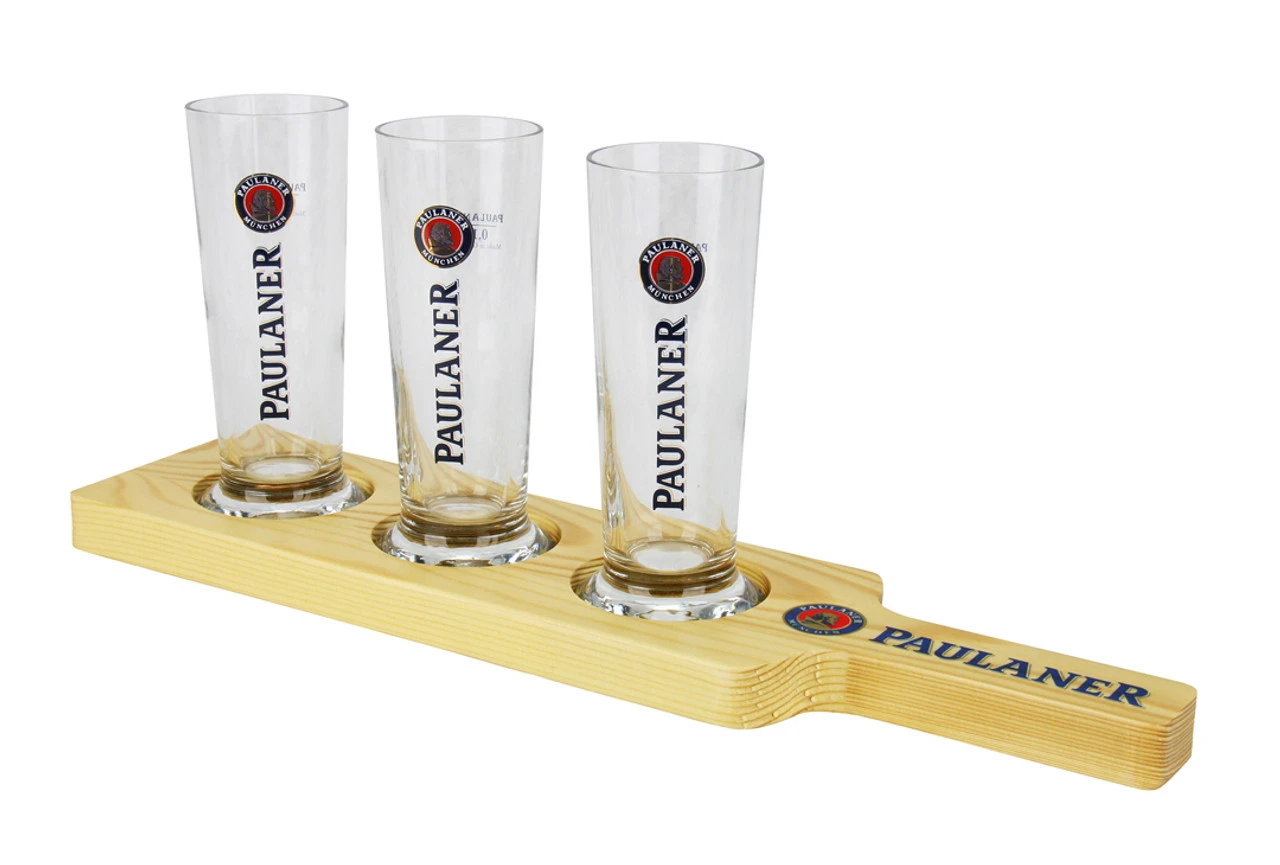 Includes: Paulaner branded wooden paddle with three tasting glasses
