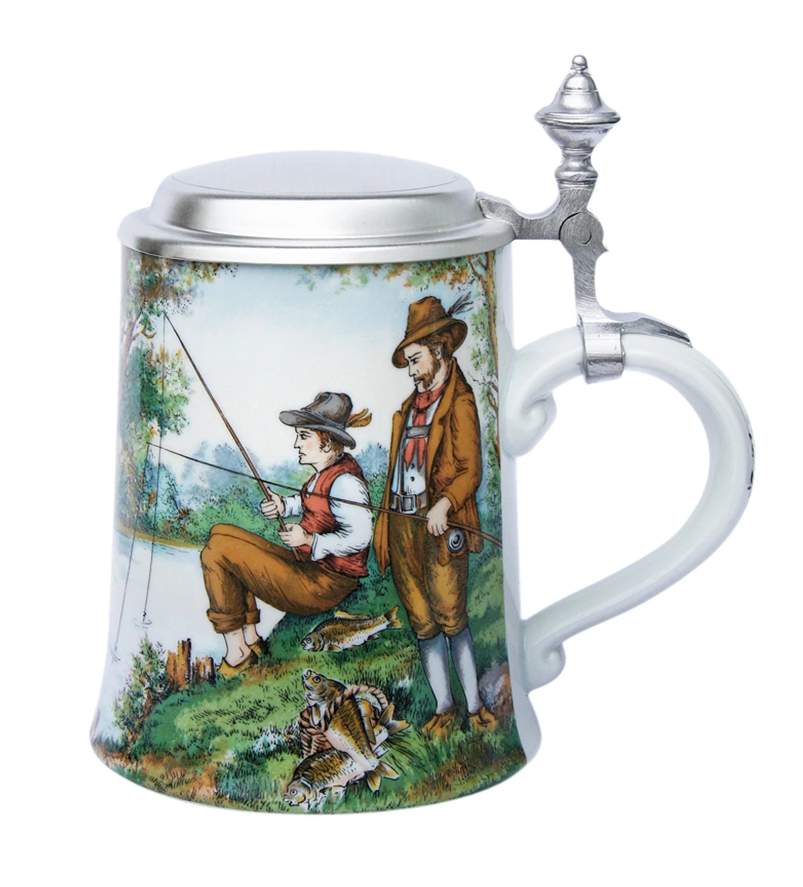 This porcelain stein features a colorful full wrap panorama of an idyllic river scene with men fishing on the shore and in boats. The shore shows baskets & buckets brimming with the days catch. The handle reads “Petri Heil” which translates as: “Good Fishing” – a traditional greeting among anglers.